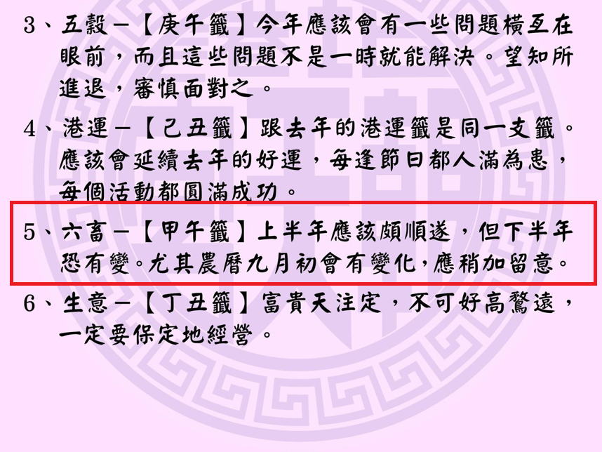 一一四年乙已年北港朝天宮公籤中,六畜部分圍甲午籤,上半年應該頗順遂,但下半年恐有變,尤其農歷九月初會有變化,應稍加留意。