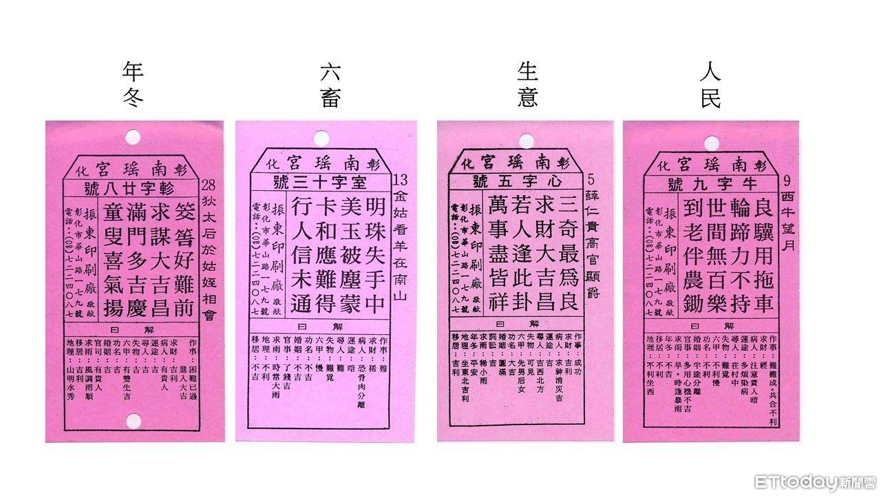 其中六畜籤的部分是「小凶至中平,籤文為「明珠失手中,美玉被塵蒙,卡和應難得,行人信未通。」南瑤宮解釋,農牧業及相關資源需謹慎應對。籤詩以明珠失落、美玉蒙塵為喻,暗示產業發展可能遭遇溝通障礙或資源運用效率不彰的問題。「卡和應難得」與「行人信未通」更提醒相關從業人員應加強風險管理,建立完善的危機處理機制。