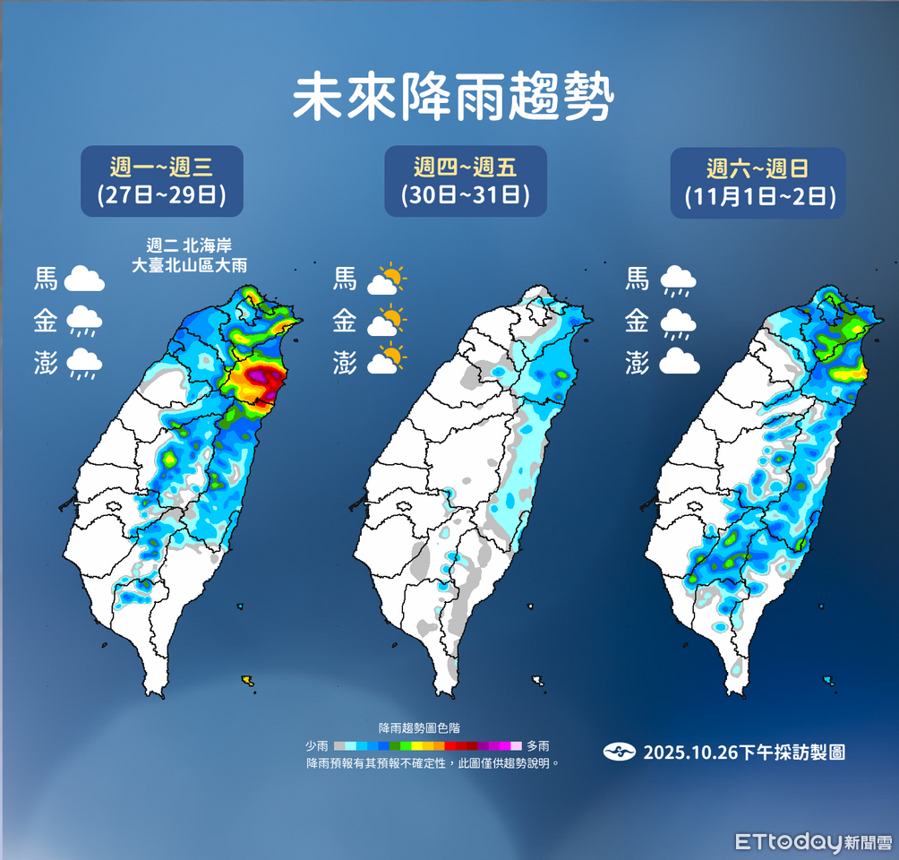 溫度方面,劉沛滕指出,受東北季風影響,北部低溫約21度,周二清晨低溫可能接近20度。周四白天短暫回溫,北部高溫28度、低溫23度。周五另一波東北季風影響,再度降溫,下周日低溫更有機會到19度。