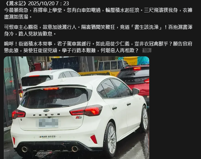 原PO本月20日在暴雨中撐傘步行,突然被一輛快速駛過的白色轎車濺濕全身,氣得在Threads上創作多篇作品,包括古文題材的〈濺水記〉、英文詩〈To the White-Car Driver〉、散文〈水漬〉及〈致暴雨中的白車〉等多種形式的文體,笑倒一眾網友。