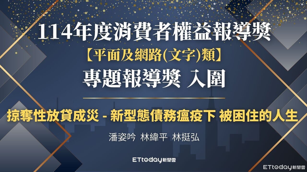 「114年消費者權益報導獎」稍早公布入圍名單,《東森新媒體ETtoday》製作的「掠奪性放貸成災:新型態債務瘟疫下 被困住的人生」入圍平面及網路(文字)類專題報導獎,各獎項得獎名單將於11月18日頒獎典禮上揭曉。