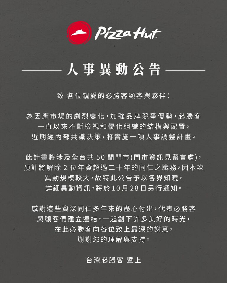 公告續指出,「此計畫將涉及全台共50間門市,預計將解除2位年資超過二十年的同仁之職務,因本次異動規模較大,故特此公告予以各界知曉,詳細異動資訊,將於10月28日另行通知。感謝這些資深同仁多年來的盡心付出,代表必勝客與顧客們建立連結,一起創下許多美好的時光,在此必勝客向各位致上最深的謝意,謝謝您的理解與支持」。