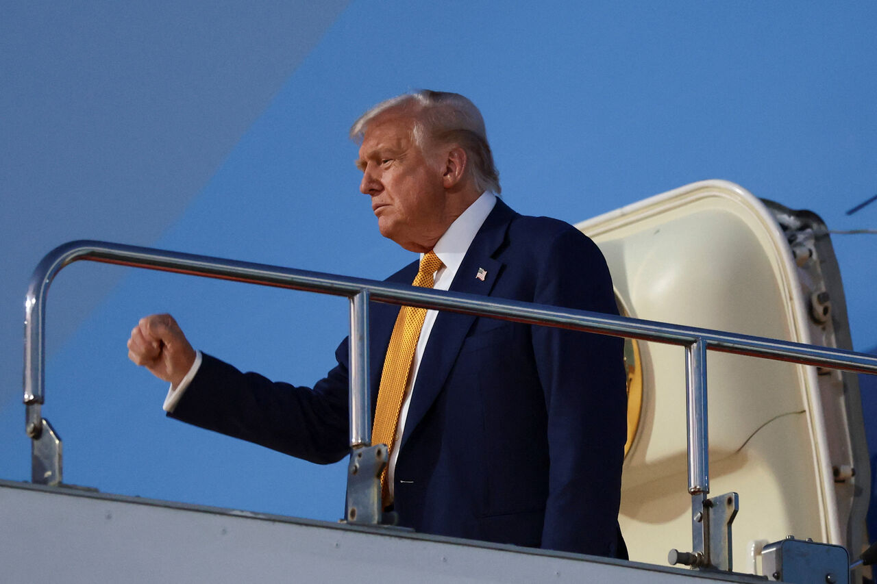 ▲ 美國總統川普27日下午抵達羽田機場,走下專機空軍一號。(圖/路透)