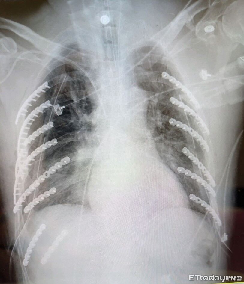 衛生福利部台中醫院胸腔外科何蕙如師指出,患者入院時胸腔X光片顯示雙側肋骨共二十八根中,有十四根斷裂,有的甚至斷成兩至三截,情況相當罕見。「比起一般肋骨骨折三至五根,他的傷勢幾乎是三倍以上」,同時還伴隨左鎖骨、脊柱裂傷及嚴重氣胸、呼吸衰竭。
