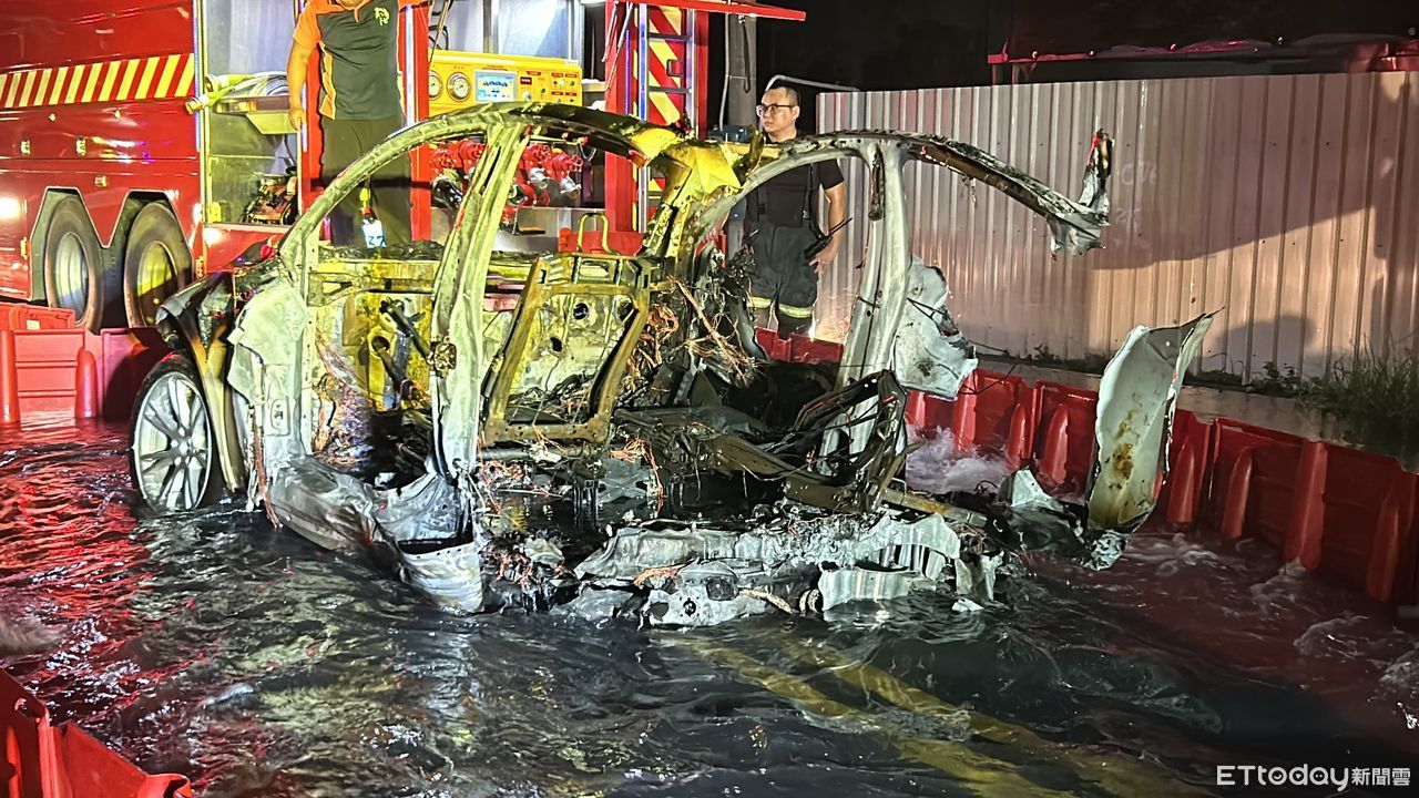 ▲雲林特斯拉從高6.5米的國道陸橋墜落平面道路,當場斷成兩截、起火燃燒。(圖/記者蔡佩旻攝)