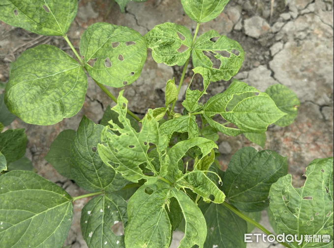 ▲斜紋夜蛾幼蟲於紅豆葉片上之食痕。(圖/高雄區農改場提供)