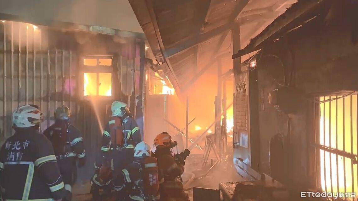 ▲新北市新店區北宜路一段巷內鐵皮屋竄出火舌,警消人員到場全力救援。(圖/記者陸運陞翻攝)