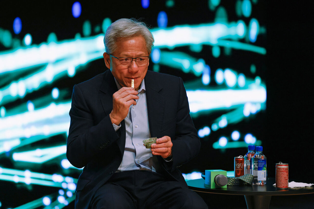 ▲輝達執行長黃仁勳在韓國新聞發布會上享用小吃。(圖/路透)