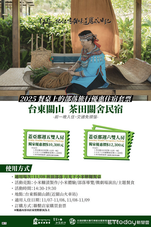 由交通部觀光署花東縱谷國家風景區管理處辦理的「縱谷原遊會—餐桌上的部落旅行」今年以「保存」為主題,邀請遊客進到五個部落體驗參與。其中「崁頂部落-月光下小米鞦韆餐桌」將於11/8星期六登場,遊客在行程中可認識布農族人以「小米」為核心的生活文化,也能在遊程間體驗過去被視為廢棄物的「小米糠」,重新製成酸甜鹹香的小米糠漬,成為此行最佳的紀念品。