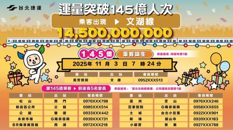 為感謝乘客長期支持,北捷同步舉辦「預測第145億人次進站路線」活動,凡透過「台北捷運Go」App參與預測,並正確猜中「文湖線」者,可抽捷運點1450點、捷運點145點、北捷城市意象溫感造型杯或捷米絨毛娃娃等獎品;中獎名單將於11月13日公布於App,會員可於「訊息中心/個人訊息」查詢並依指示領獎。