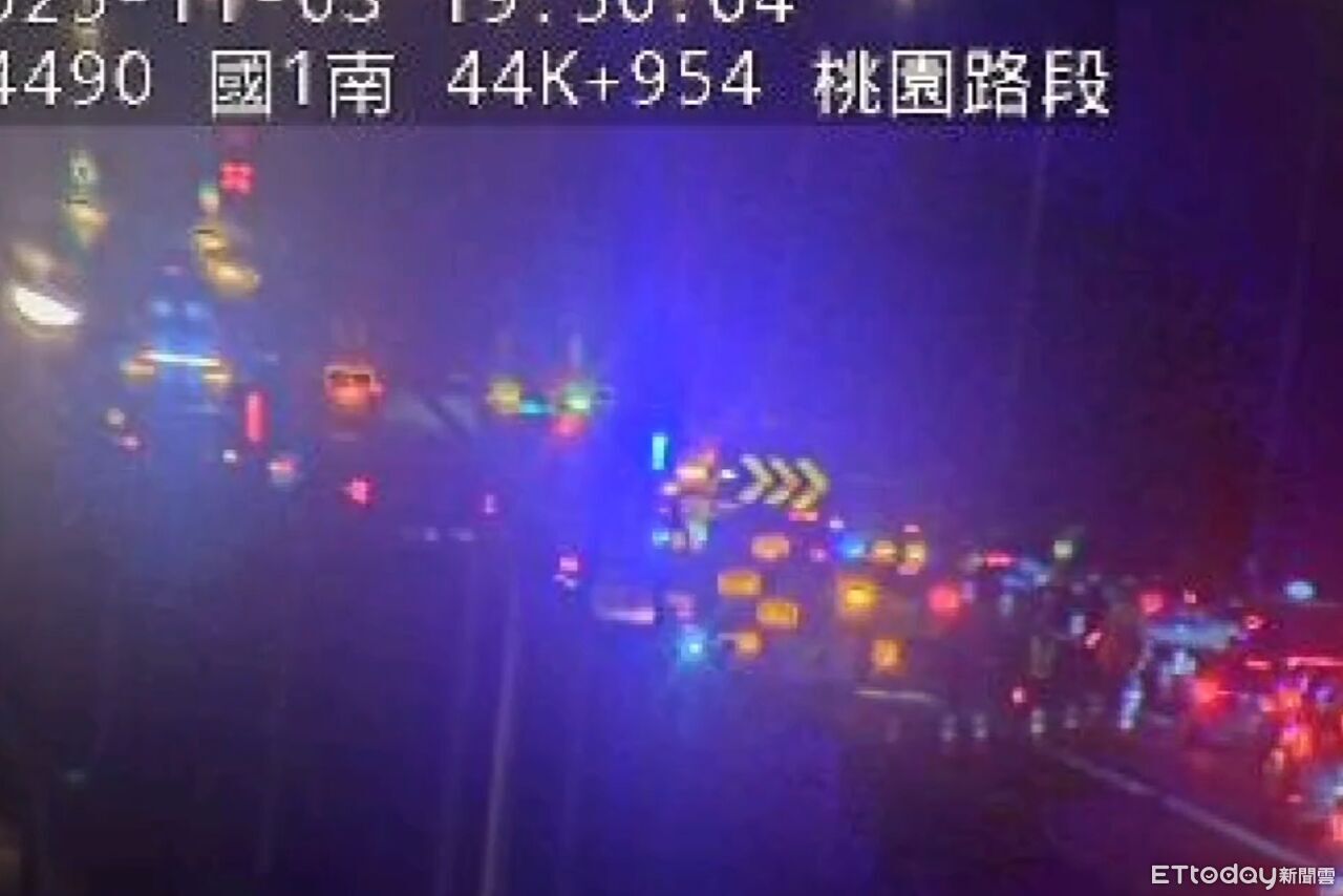 國道警方表示,今(3)日晚間7時5分接獲報案,國道1號五楊高架南向45.3公里桃園路段發生連環車禍。當時下雨路面濕滑,現場有5小客車和1小貨車先在內側車道發生2起追撞,後又遭一輛大型遊覽車追撞,造成2男2女受傷,其中一名小客車女駕駛下車處理時被追撞,導致受困車底重傷,當場失去生命跡象,送醫搶救中。