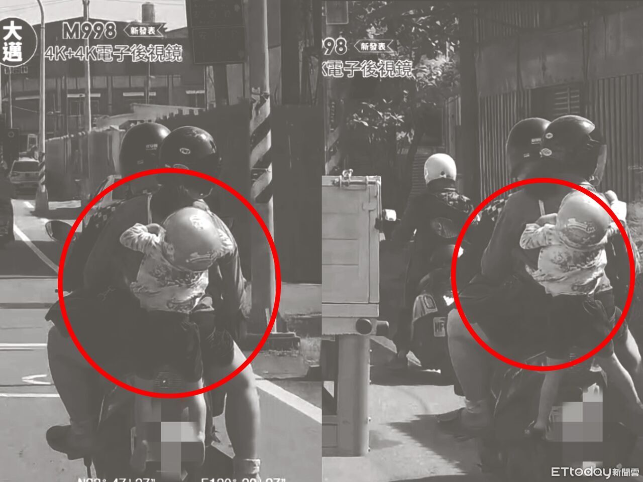Youtube頻道「WoWtchout - 地圖型行車影像分享平台」上傳一段畫面,只見一對夫妻騎機車四貼載童上路,在後座的小孩已經擠到根本沒有位置坐,被媽媽用揹帶背著,身體懸空掛在機車外,危險行徑讓人看了直呼太誇張。
