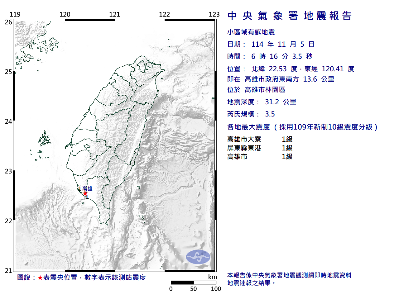 地牛翻身!根據中央氣象署地震測報中心資料,今天清晨6時16分高雄市林園區發生芮氏規模3.5的小區域地震,震央在高雄市政府東南方13.6公里處,深度31.2公里,屬於淺層地震。