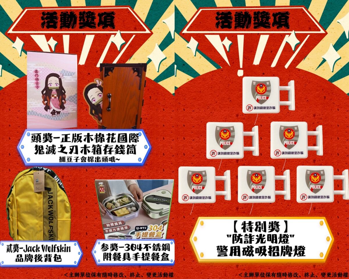 警方為了在雙11購物節宣導阻詐,為避免制式宣導模式民眾感到乏味,特別舉辦「網路購物五字訣.安心消費不遇劫」防詐網路抽獎活動。本次抽獎品有,鬼滅之刃木箱存錢筒、磁吸招牌警燈、刑警賓士貓與黃金獵犬等,總計70組獎品。