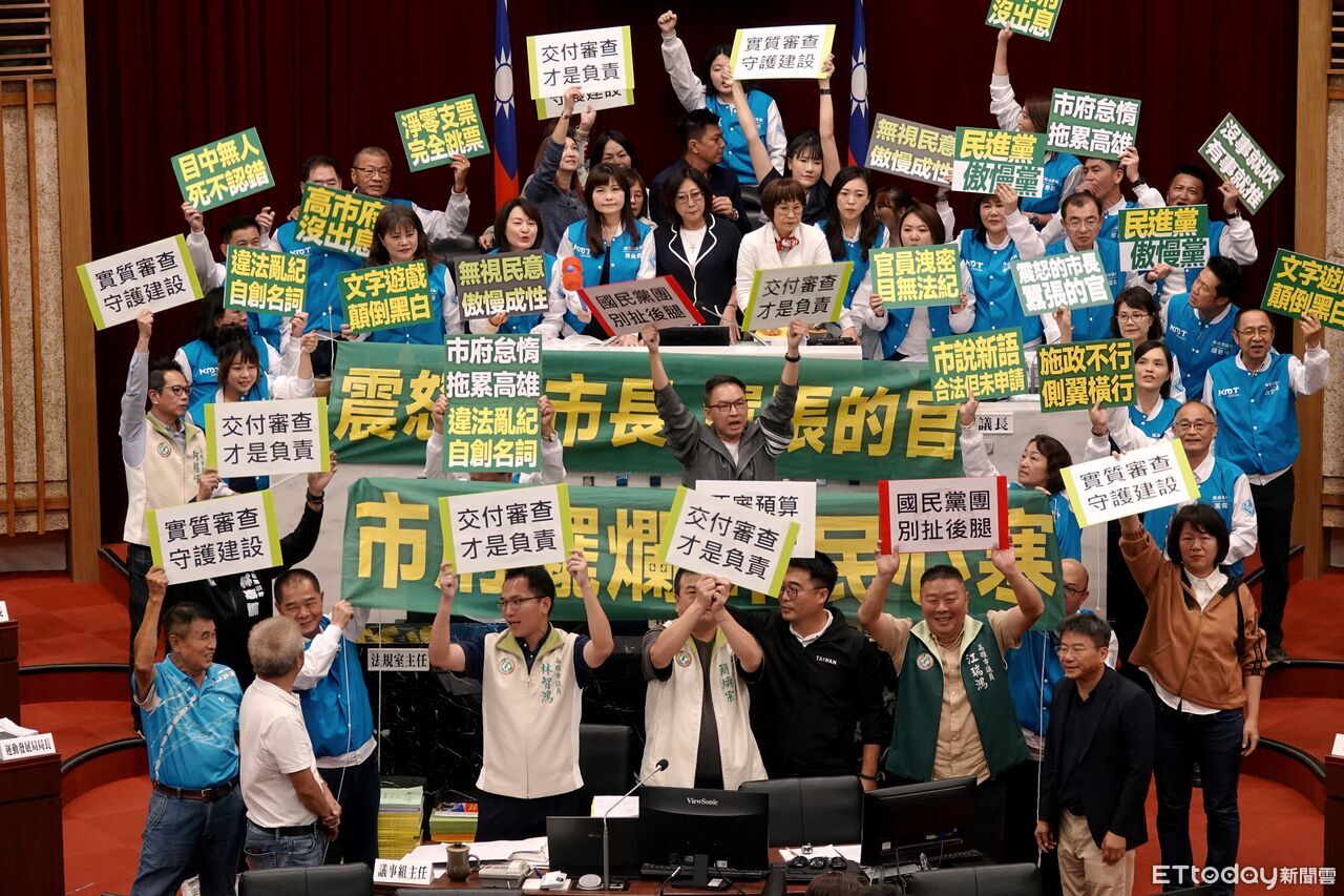 ▲高雄市議會在11日爆發推擠衝突,對於陳其邁離席,國民黨議員包圍主席台 。(圖/記者吳奕靖翻攝)
