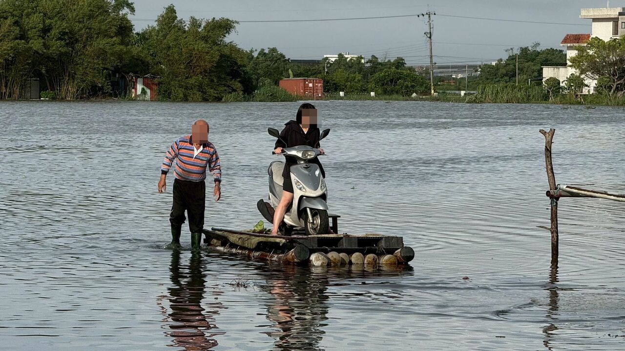 林先生表示,平常是從事捕魚的工作,所以使用竹筏是駕輕就熟,因為女兒在博愛醫院上班,今天因為淹水,所以用竹筏連人帶車讓女兒度過水流到路上。
