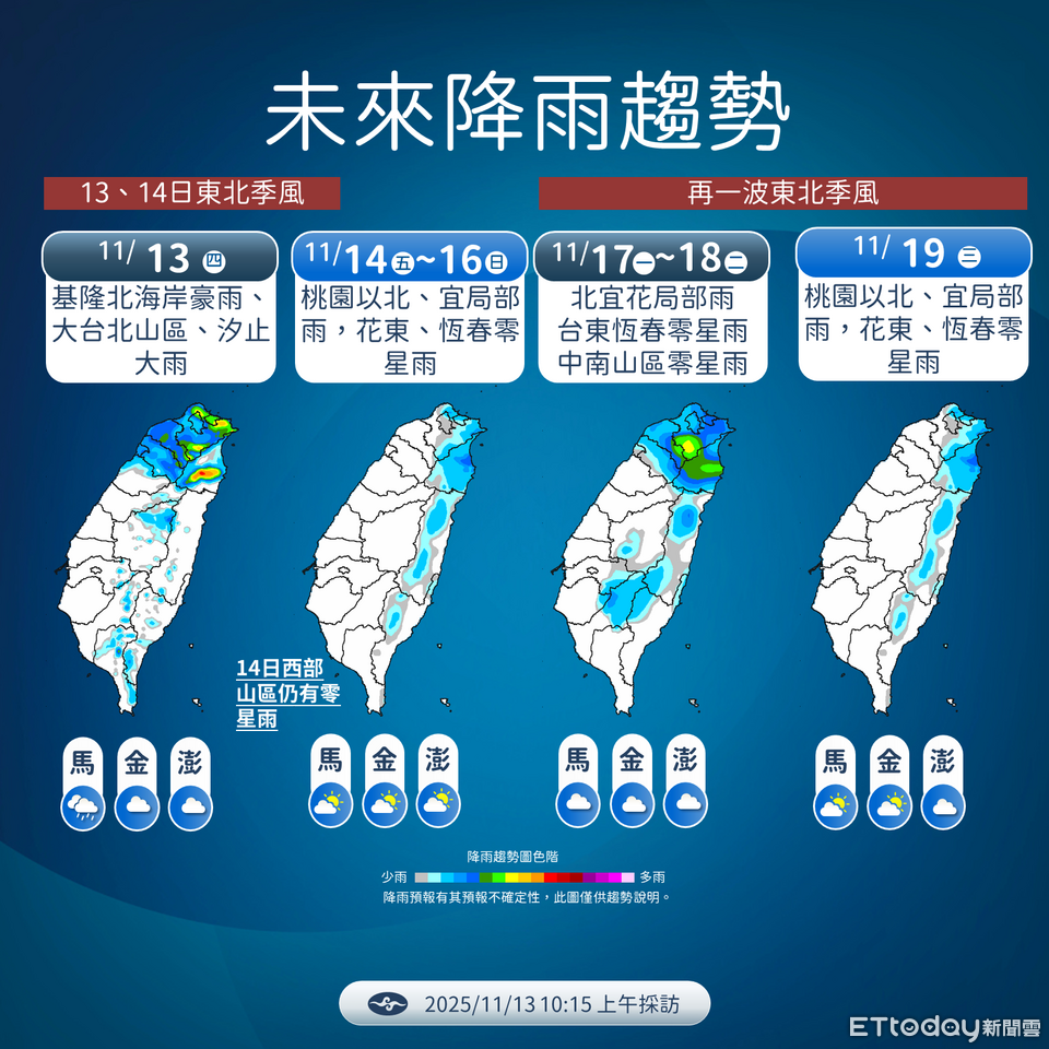今天受東北季風影響,北部及宜蘭降雨增多,基隆北海岸、汐止及大台北山區有局部大雨或豪雨。周末降雨短暫趨緩、回溫,下周一將有入秋以來最強東北季風報到,屆時雨區擴大,低溫下探15度。