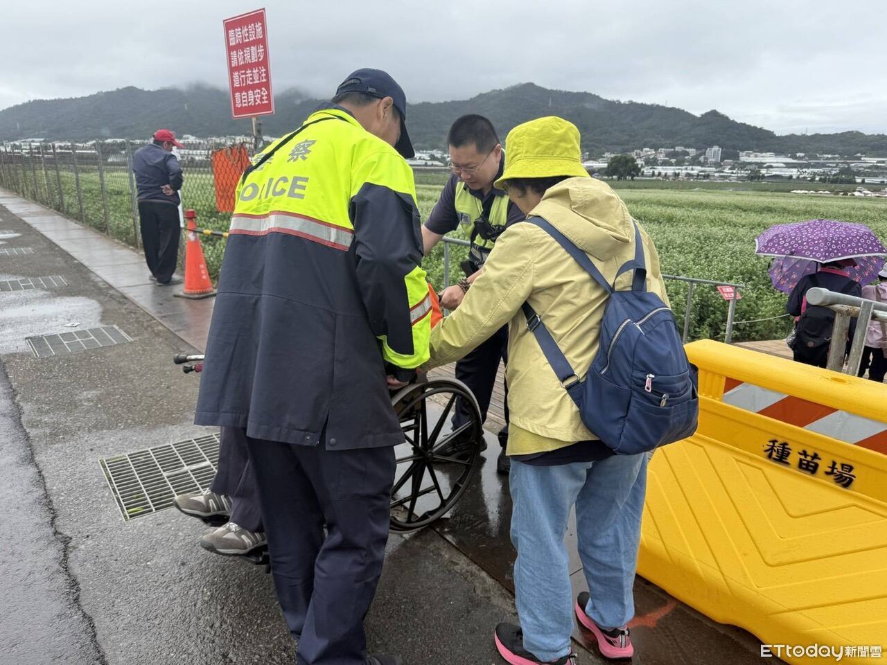 活動期間人潮絡繹不絕,園區入口處時常可見推著嬰兒車與輪椅的遊客。今日中午11時50分許,一位行動不便的長者在家屬陪同下前來賞花,因地勢起伏及木棧道坡度較大,推輪椅進入花毯區時遇到困難。正在現場執勤的東勢分局員警見狀,立即主動上前協助,一同推著輪椅緩緩前進,並細心提醒周遭遊客注意通行安全。