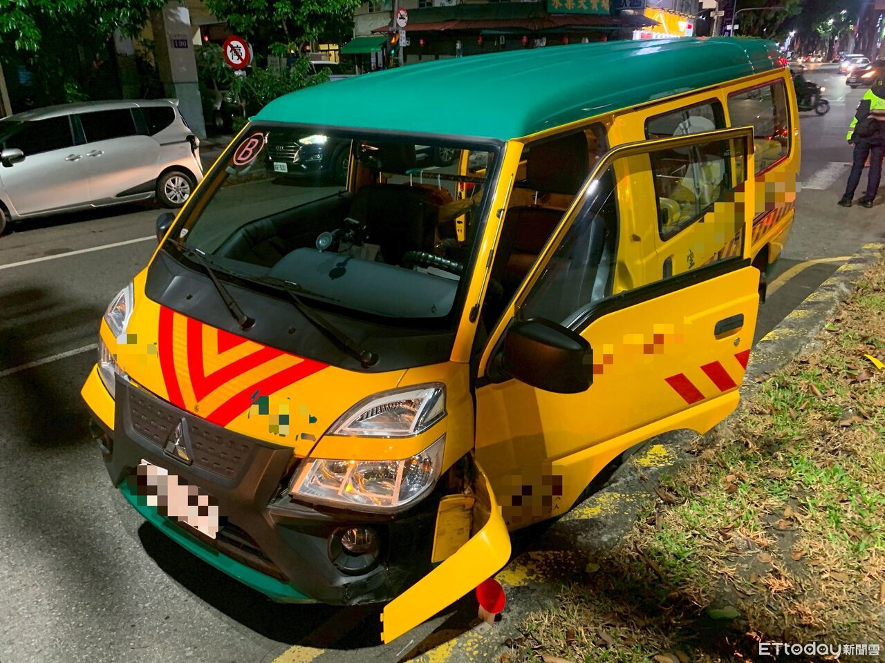 ▲台中幼兒園娃娃車自撞分隔島,司機疑腦溢血昏迷。(圖/記者許權毅翻攝,下同)