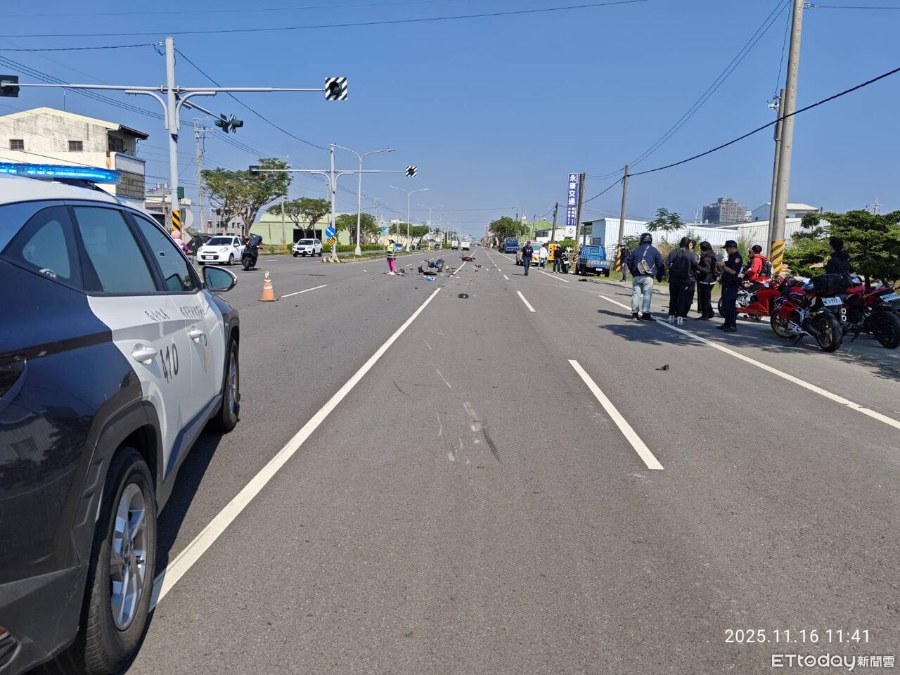 台南善化台1線313K處今(16日)上午11時19分傳出一起嚴重車禍,2部同向機車因不明原因發生追撞,導致其中一名郭姓女騎士(65歲)當場倒地、失去呼吸心跳,經緊急送往麻豆新樓醫院搶救後,仍因傷勢過重,稍早宣告不治死亡。
