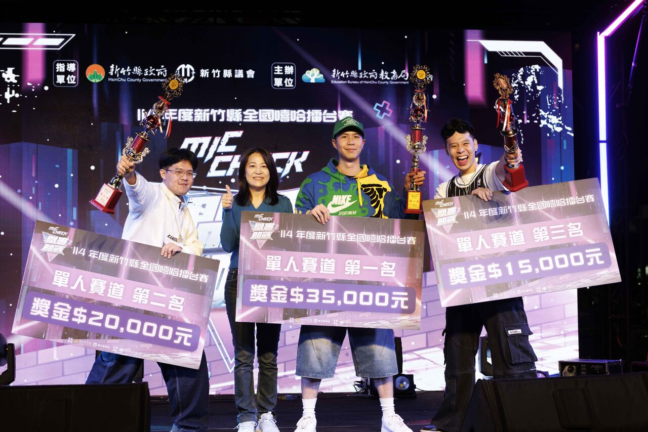 年輕人正是勇於表達想法、展現無限能量的時刻,而一個能盡情發聲的舞台,更是激發創意的重要推手,由新竹縣政府教育局主辦的《Mic Check:開麥即戰》114年度全國嘻哈擂台賽決賽,11/23在竹北遠東百貨戶外廣場強勢開戰,吸引大批人潮,本屆活動自海選階段就備受矚目,吸引全國近200位、平均年齡僅23歲的新生代饒舌選手報名參戰,經過海選競賽選出單人賽13位選手、團體賽9組團隊,頂尖好手站上舞台比拼真功夫,角逐總獎金18萬元!