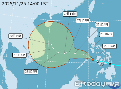 中央氣象署預報員黃恩鴻表示,熱帶性低氣壓TD30目前在菲律賓南側,預計今晚到明天增強為颱風,未來持續往西朝中南半島移動,對台灣沒有直接影響,但明天到周五可能為東半部及恆春半島帶來長浪。