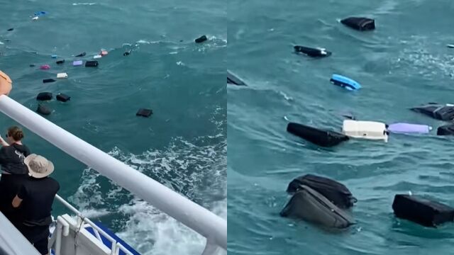 多名乘客將相關畫面上傳TikTok,總瀏覽量已破百萬次。其中一段影片中,乘客們站在甲板上,遠遠望向隨波逐流、各式各樣的行李箱。在另一段影片中,坐在室內客艙的人們集體傻眼盯著窗外的家當。