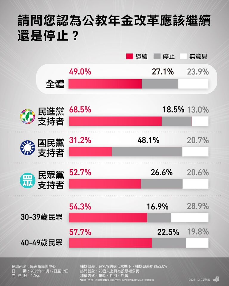 國民黨團、民眾黨團力主停砍公教人員退休金,而粗算後,若停砍年金,公教的退撫基金將分別在民國131年、129年提前用罄。民進黨今(4日)召開記者會,公布最新年金改革民調,49%民眾支持繼續推動年金改革,僅27%贊成停止改革;若停止改革導致退撫基金破產由全民買單,高達76.2%的民眾認為不合理,僅11.9%認為合理。