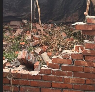 ▲砲彈射穿樹木及磚造牆壁。(圖/民眾提供)