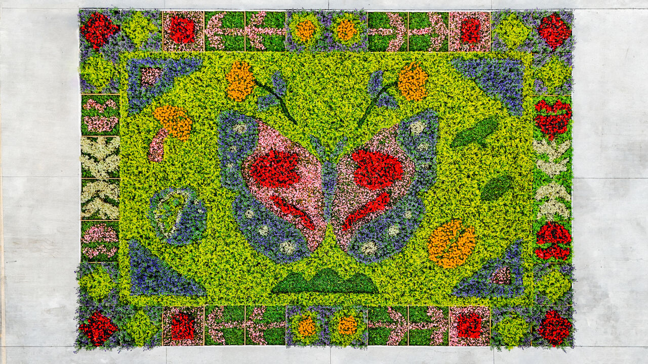 此次花卉嘉年華活動最吸睛的莫過於首次亮相的「地景花毯」,位於恒吉宮廟前廣場,由在地社區與花藝師攜手創作,以埔里象徵性的「蝴蝶」與「山水」意象為主軸,運用在地花卉層層拼接成鮮豔畫面,展現自然、人文與藝術交織的氣韻,也象徵著埔里深厚的文化底蘊。現場也推出結合信仰文化、花藝手作與文創走讀的「小旅行遊程」,讓遊客以不同視角深入體驗埔里花卉的多重風貌。