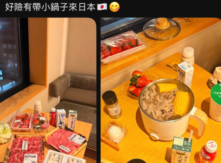 文章曝光後,引發台日網友看傻砲轟,女網友隨即刪文避風頭,但仍遭到截圖被討論,「飯店不提供廚房,就不可以煮食是常識吧?要煮就去住民宿,或者有廚房的飯店好嗎?」「想煮東西就是去住民宿,帶鍋子出國,丟人現眼還不自知」、「前陣子一堆網紅和foodie一直在推啊,去日本旅遊在一般飯店裡用這種小鍋、折疊鍋煮東西吃」、「這個抖音、小紅書有中國人用熱水壺煮火鍋」「要這樣不如就別出國了,在台灣自己去超市買牛肉回家煮就好啦」、「台灣素質第一名」。
