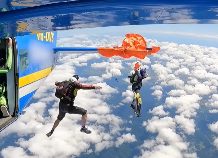 澳洲運輸安全局(ATSB)公布一段驚險影片,畫面拍下9月發生在昆士蘭州(Queensland)上空的意外,一名跳傘員在準備離機時,降落傘突然提前開啟並勾住飛機尾翼,整個人被懸掛在離地約1.5萬英尺(約4500公尺)的高空,場面驚險萬分。