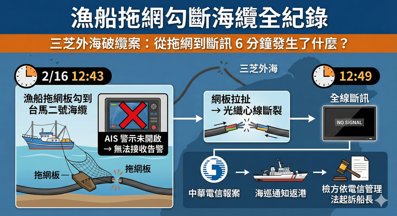 國安出現破口!中華電信日前通報,新北三芝外海「台馬第二光纖海纜」突然斷訊,影響通訊,海巡署北部分署第二海巡隊比對航跡後,鎖定一艘拖網漁船涉案。士林地檢署偵結認定,該艘漁船作業時未開啟AIS(自動識別系統)警報,也未避開海纜警戒區,導致網板勾扯電纜、心線斷裂,依《電信管理法》過失毀壞海纜罪,將呂姓船長提起公訴。