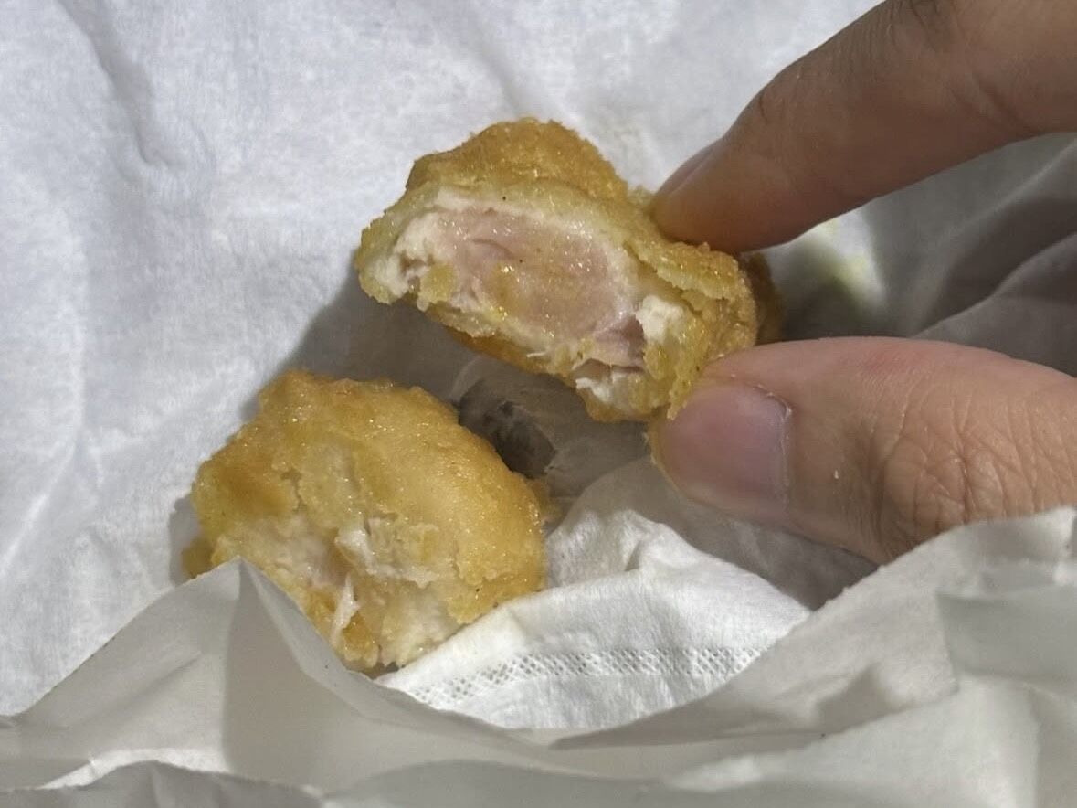 一名網友發文詢問:「麥當勞新品嗎?長這麼大第一次吃到生雞塊。」並曬出雞塊照片,可以看到雞塊中間全是生雞肉顏色,他表示吞了1塊後咬到第2塊時吐出來,剩下其他2塊也都是生的,「超噁!吃進去不對勁,找紙袋還沒給衛生紙。」他打給店家還僅得到提供優惠券下次兌換,忍不住嘲諷說:「感覺不是很嚴重的事。」