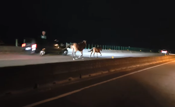 苗栗縣後龍鎮西濱快速道路13日晚間6點左右驚見2匹馬匹闖入車道,警方先後接獲民眾通報,指稱道路上有馬匹行走影響行車安全,隨後即傳出車輛與馬匹碰撞事故。外埔派出所員警獲報後立即趕赴現場,實施交通管制並進行疏導,防止二次事故發生。