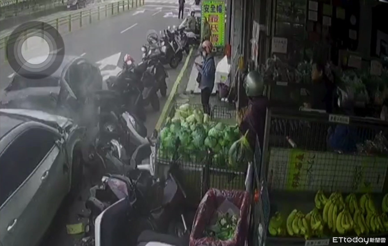 監視器畫面拍下,當時蔬果行前停了多部汽機車,而楊男開著白色自小客經過該路段,過彎時卻偏離車道,猛地撞上停在路旁的小客車,強大的撞擊力道再向前推撞,一連掃倒8台機車,現場零件碎片四散、還飄出陣陣汽油味,楊男的車也撞到凹陷、變形爛毀。