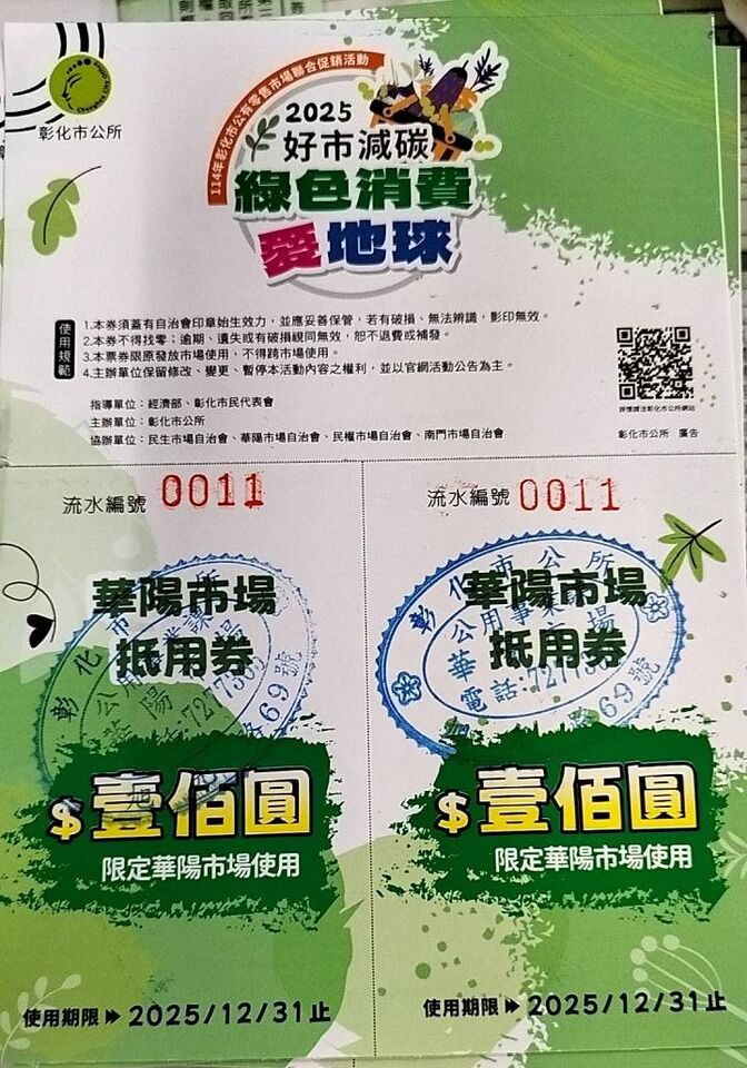年底採買旺季到,彰化市民逛菜市場不僅能省錢,還有機會把可愛的造型娃娃帶回家!為活絡市場經濟、鼓勵綠色消費,彰化市公所將於12/19至20日、12/26至27日,在 民生、華陽、民權、南門 等四處公有零售市場,舉辦「市場聯合促銷活動」,100元現金換200元加倍券,限量2400張,要讓民眾買菜加倍划算、自備購物袋還能愛地球。