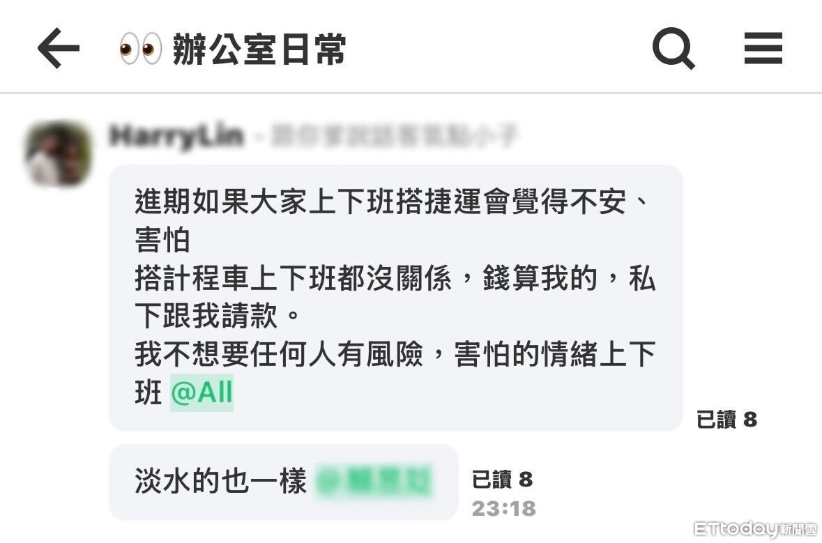 該名網友在Threads帳號「@sangyyyyy_310」上發文貼出老闆的訊息,從圖片可見,老闆寫道「近期如果大家上下班搭捷運會覺得不安、害怕,搭計程車上下班都沒關係,錢算我的,私下跟我請款。我不想要任何人有風險,害怕的情緒上下班。」