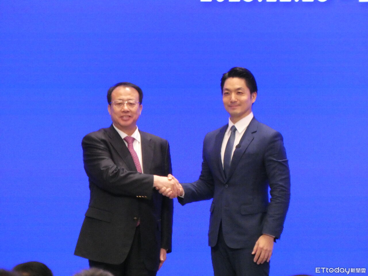 ▼台北市長蔣萬安與上海市長龔正在主論壇上握手。(圖/記者陳冠宇攝)