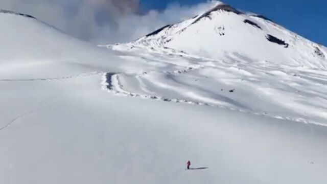 義大利西西里島埃特納火山(Mount Etna)27日噴發,火山灰柱和濃煙直衝雲霄時,下方山坡竟然還有滑雪客拚命逃離,驚險畫面令人捏一把冷汗。