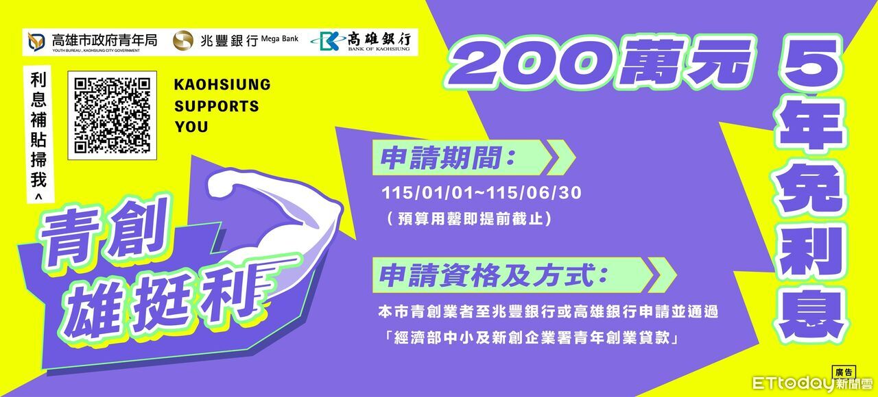 青年局補充說,114年度「雄挺利」第二期申請期間自115年1月1日起至6月30日止。凡設籍本市滿3個月之18歲至45歲青年,其公司設立或商業登記於本市8年內且資本額1,000萬以下均可申請。符合資格者可向兆豐銀行或高雄銀行營業部辦理,享有貸款本金最高200萬元、最長5年的利息補貼(補貼利率上限2.5%)。