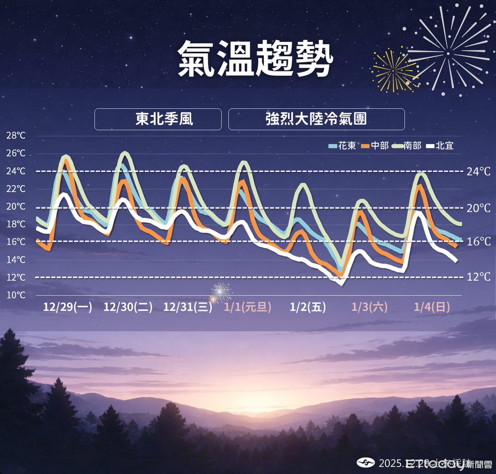 明天東北季風增強,新竹以北及宜蘭降雨持續,略為降溫,預計持續到周四元旦。周四晚間逐漸受首波強烈大陸冷氣團影響,溫度由北往南下降,周五、周六全台有感降溫,局部地區下探7度。
