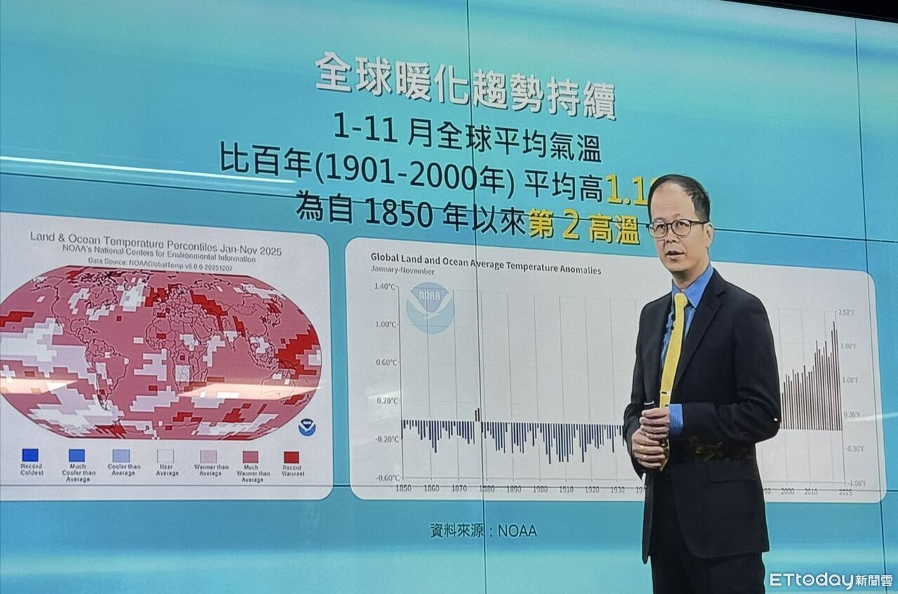 氣象預報中心主任黃椿喜表示,全球暖化下,今年1至11月全球平均氣溫較1901至2000年百年平均高約1.18度,成為1850年以來史上第2高溫年,僅次於去年。氣候變遷下,極端事件也不斷發生,像是美國1月野火、7月強降雨、亞馬遜河乾旱事件、6至8月歐洲及地中海有熱浪、西南亞乾旱、韓國有野火及熱浪侵襲、南半球也有極端降雨。