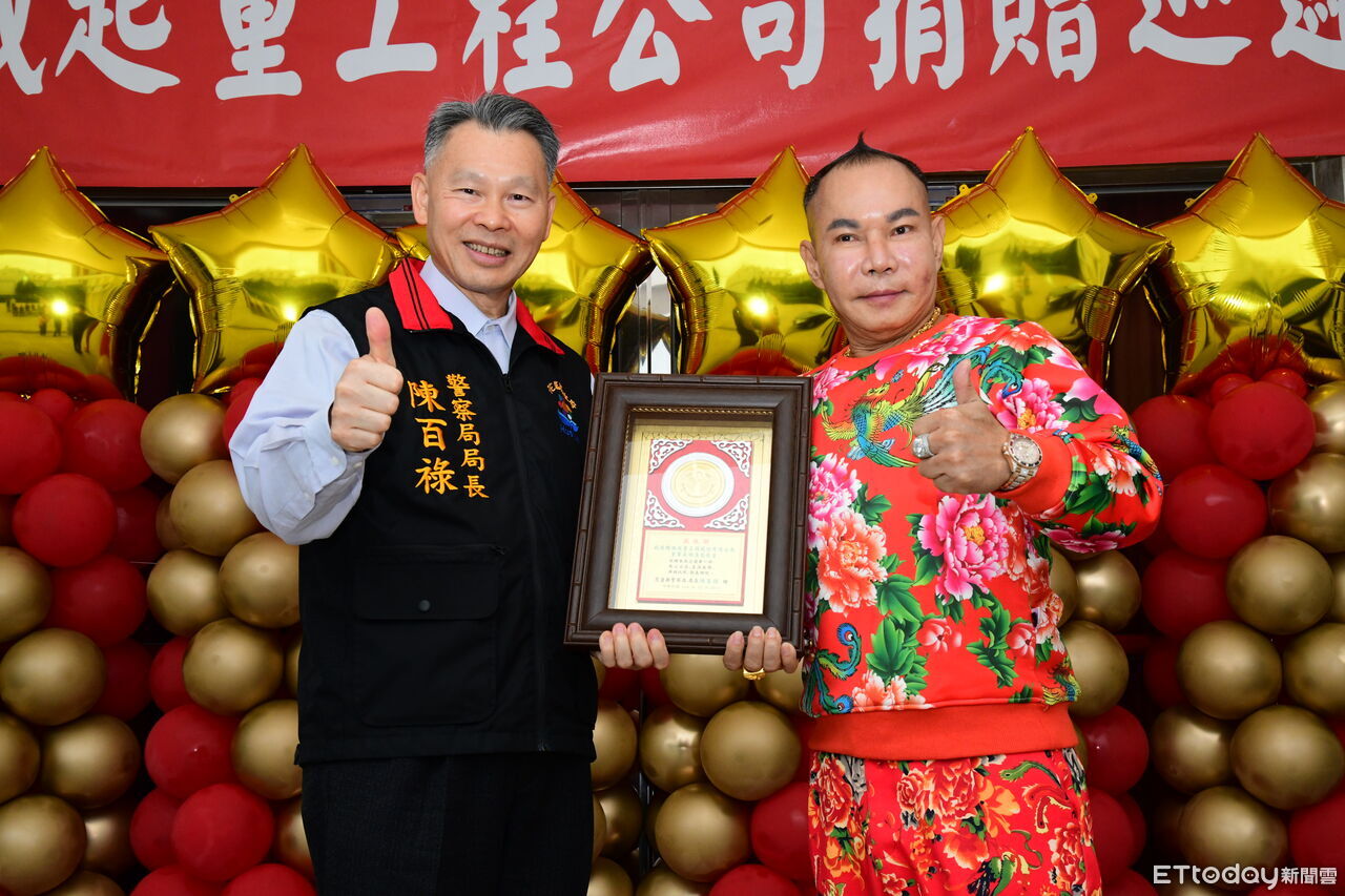 ▲「新竹吊車大王」胡漢龑(右)捐贈巡邏車由花蓮縣警察局局長陳百祿(左)代表受贈。(圖/花蓮縣警察局提供,下同)