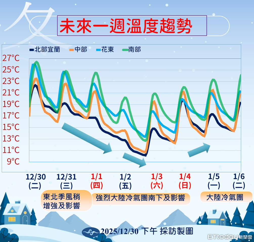明天東北季風影響,桃園以北、宜蘭都有局部短暫雨,基隆北海岸、大台北山區留意局部大雨。後天元旦強烈大陸冷氣團南下,周五晚間至周六清晨是最冷時間點,低溫下探6度,其中,周五北部、東北部1500至2000公尺高山有降雪機率。