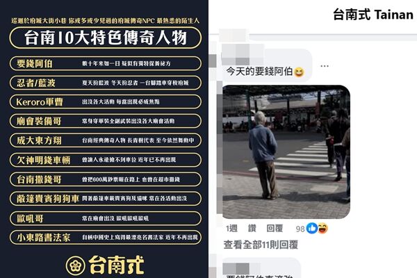 臉書粉專「台南式 Tainan Style」近日發文,整理出台南10大特色傳奇人物,詢問廣大在地人,是否曾遇過他們。PO文曝光後引起熱烈回響,其中「要錢阿伯」因數十年如一日的樣貌,與超長出沒紀錄,被網友封為台南傳奇代表之首。