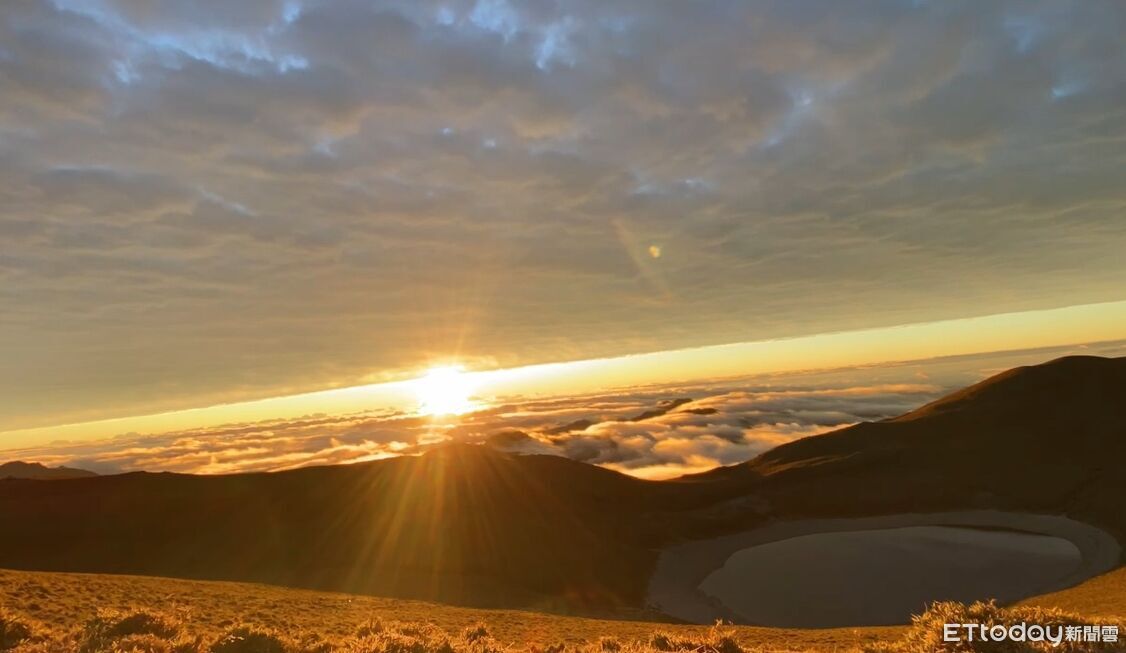 新的1年到來,有民眾昨晚不畏嚴寒,特地登上海拔3310公尺、有「天使的眼淚」之稱的嘉明湖,就為了迎接2026年第一道曙光,從拍下的畫面可見,嘉明湖下雲海湧動,金黃色的太陽在滿天流動的雲彩中緩緩升起,整個世界瞬間變得金光閃閃,充滿希望。