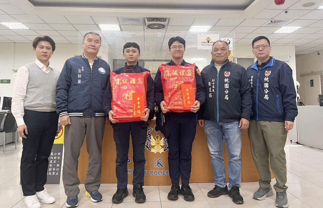 ▲桃園警方破案後,副分局長黃呈錫(右二)等長官頒發禮品給破案有功員警。(圖/桃園警方提供)