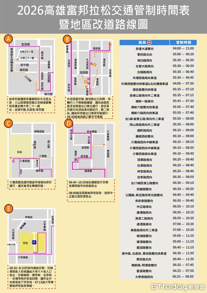 今年賽事特別安排跑者經過北高雄相關行政區之全新路線,針對交通管制路段,賽事路線使用道路不開放車行,請用路人避開交通管制路段,提前規劃出門路線並配合改道通行。