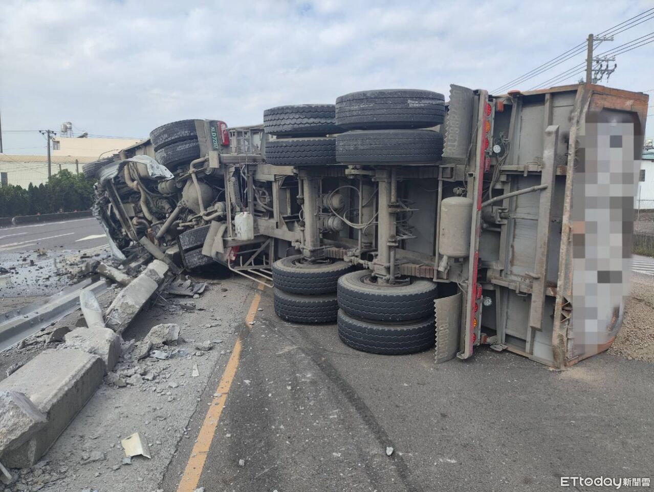 ▲新園鄉台17線雙園大橋前砂石車翻覆。(圖/記者陳崑福翻攝)
